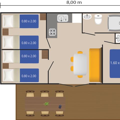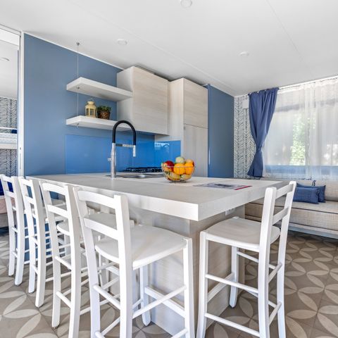Cependant, attention si vous partez avec Homair : nous sommes partis plusieurs familles de 4 et 5 personnes; nous, famille, de 5 personnes avons payé 400 euros de plus car 1 personne en plus, mais... en fait, dans ce camping, tous les mobil-homes ont la même taille et le même nombre de lits. Pire, nous qui avons payé davantage, avons hérité des mobil-homes vétustes, sans lave-vaisselle, TV, grille-pain, machine à Nespresso, bains de soleil ni bouteille de Chardonnay à l'arrivée, contrairement aux autres. Nous avions un frigo/freezer plus petit (étrange pour une famille plus nombreuse), 1 seule salle de bain ou 1 seul WC alors que les autres en avaient 2.