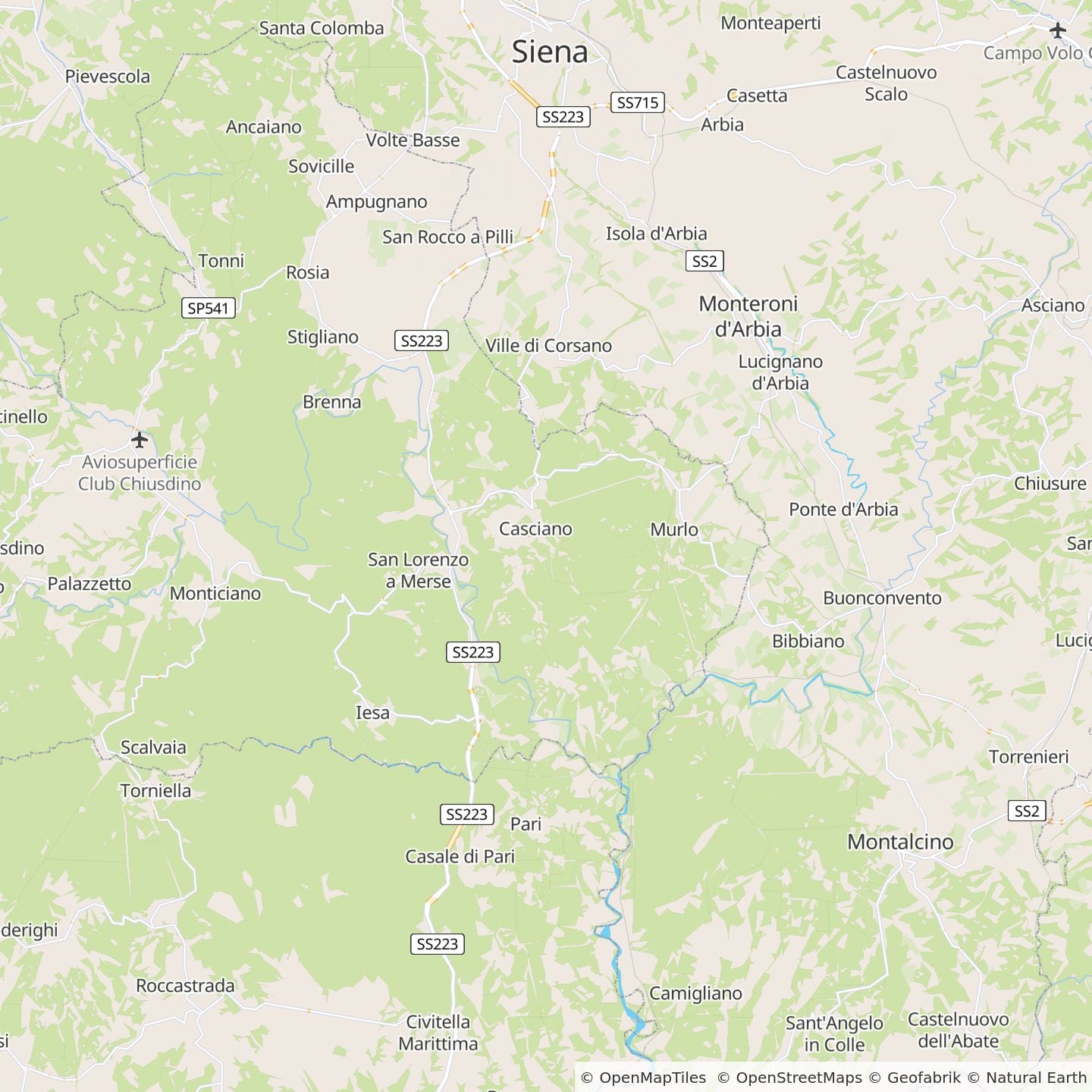 Vanuit Rome volgt u de Via Aurelia tot Grosseto, vervolgens neemt u de SS 223 richting Siena.
