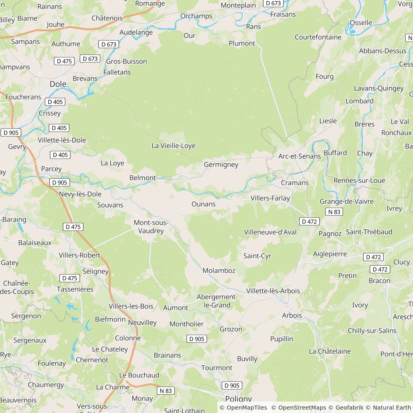 - Op 12 km van Arbois (hoofdstad van de Jurawijnen), 20 km van Dole, 50 km van Besançon en 70 km van Dijon.