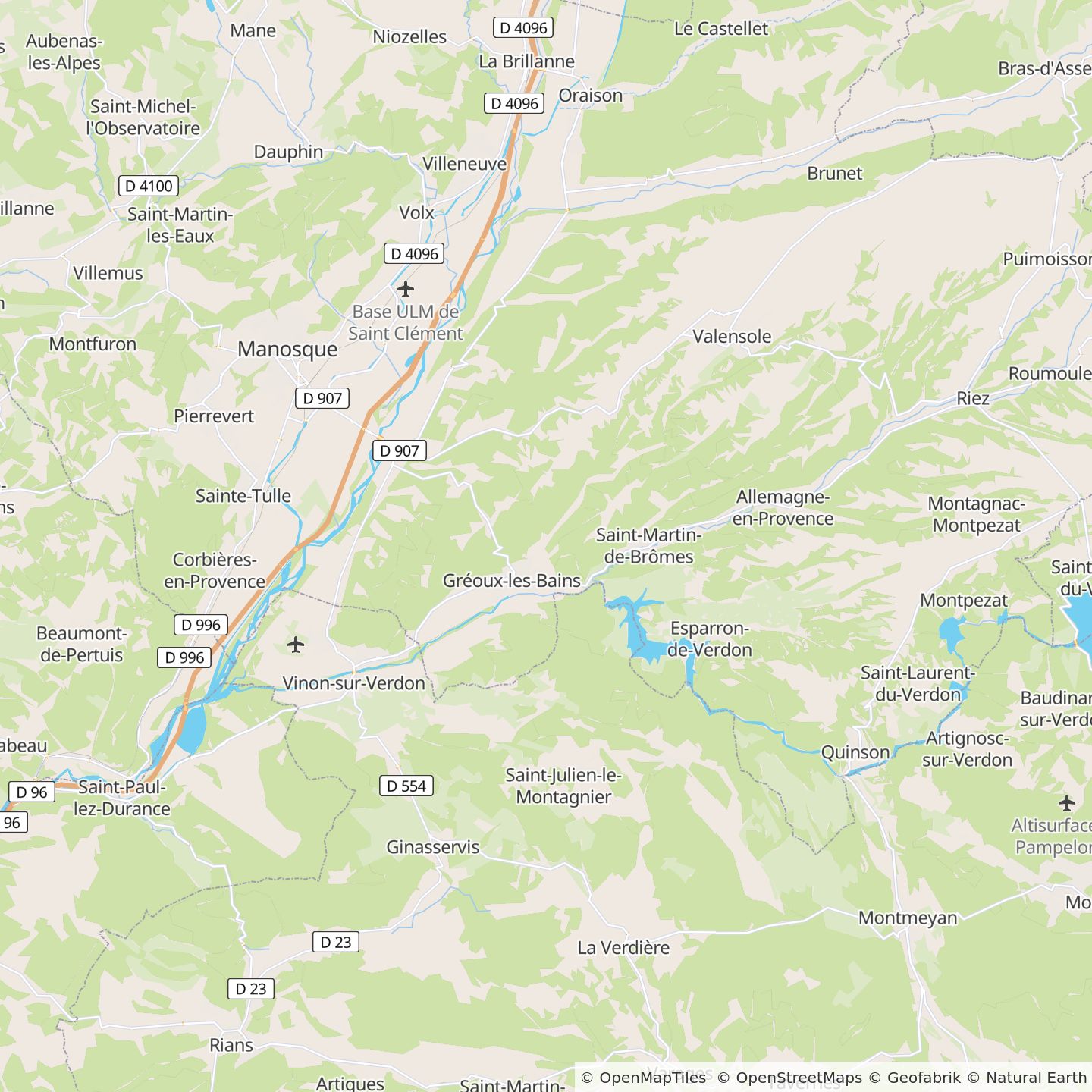 Vanaf de zuidelijke snelweg, afslag Aix, vervolgens op de Autoroute des Alpes (A51) richting Sisteron, afslag 17 Gréoux-les-Bains of afslag 18 Manosque (komend vanuit Sisteron).